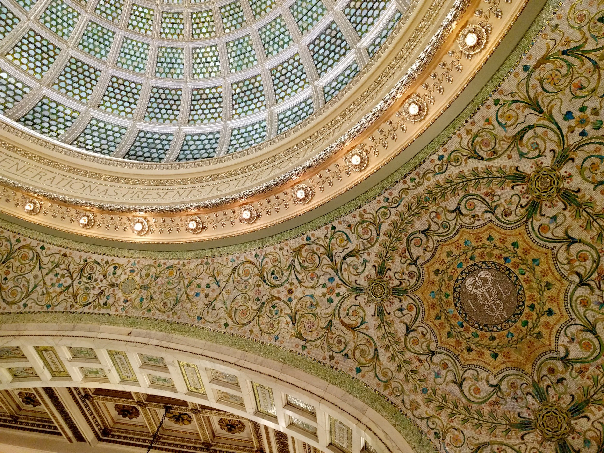 The beautifully detailed ceiling of the Chicago Cultural Center.