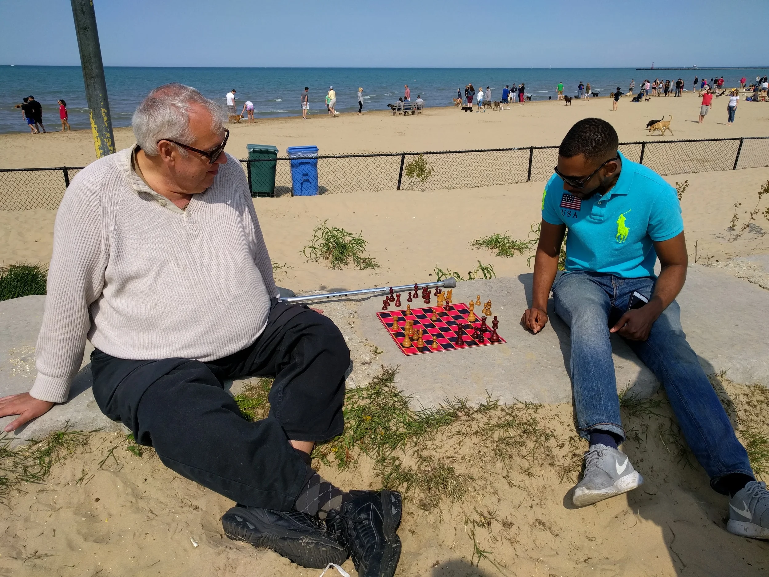 Two strangers participate in a friendly game of chess at Montrose Dog Beach.