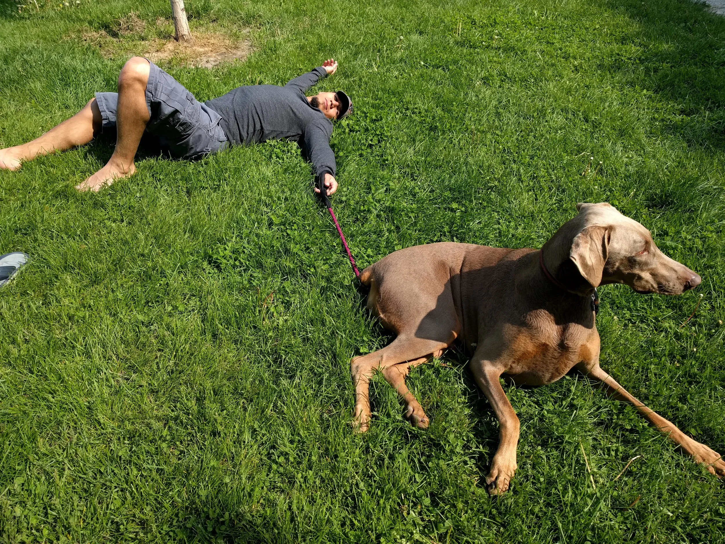 Father and daughter cool off in the grass at Montrose Dog Beach.